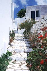 The Chora is without doubt one of the prettiest towns to be seen in the Cyclades. It stands nearly 400 metres above sea level with views of both the east and west coasts of Amorgos. A dozen or so churches are dotted around the village and there are beautiful shaded squares and narrow lanes to wander around. There are a couple of tavernas in the village which offer excellent food.
