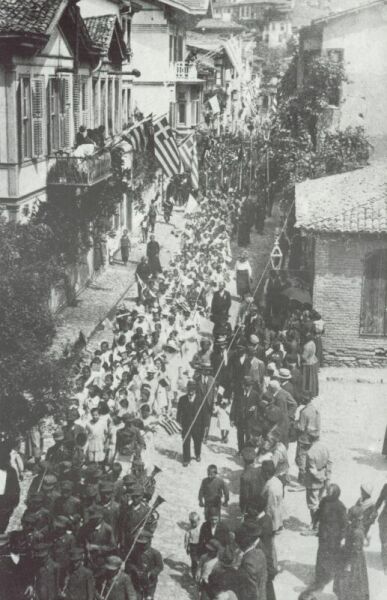 | The people of Panormos welcomes the liberating Hellenic army. On the photograph, the central street of the city. |