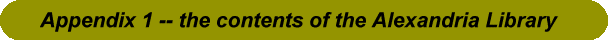 The Ancient Library Alexander the Great -- the Conquests as a source of knowledge The Founding of the Library and the Mouseion The Egyptian Section of the Alexandria Library The Papyri: Evidence of Greek and Egyptian Scientific Interchange The Pinakes -- a Bibliographical Survey of the Alexandria Library The Alexandria Library -- " The Memory of Mankind" Appendix 1 -- The Contents of the Alexandria Library Appendix 2 -- The End of the Library