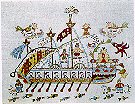 On the sky above masts and colourful sails there are paradise birds flying, hovering seamen, imaginary animals and other decorative motifs in a proliferation of cheerful colours.