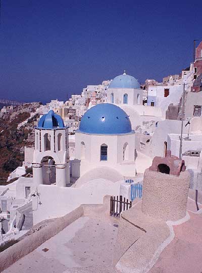 This is the capital and it is situated right on the edge of the Caldera. Cycladic domed churches, sun-bathed terraces, stepped alleys and in the background the deep blue sea and the threatening volcano comprise