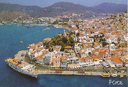 Poros lies right next to the Peloponnese. The town center of Poros is directly across from the Peloponnese village of Galatas and the two communities are separated by a body of water about 150 meters in width. Small taxiboats --some people call them "the gondolas of Poros"-- connect the town center with Galatas and contribute to the area's uniqueness.